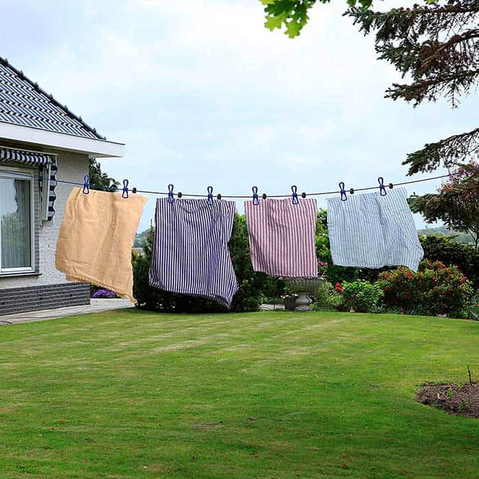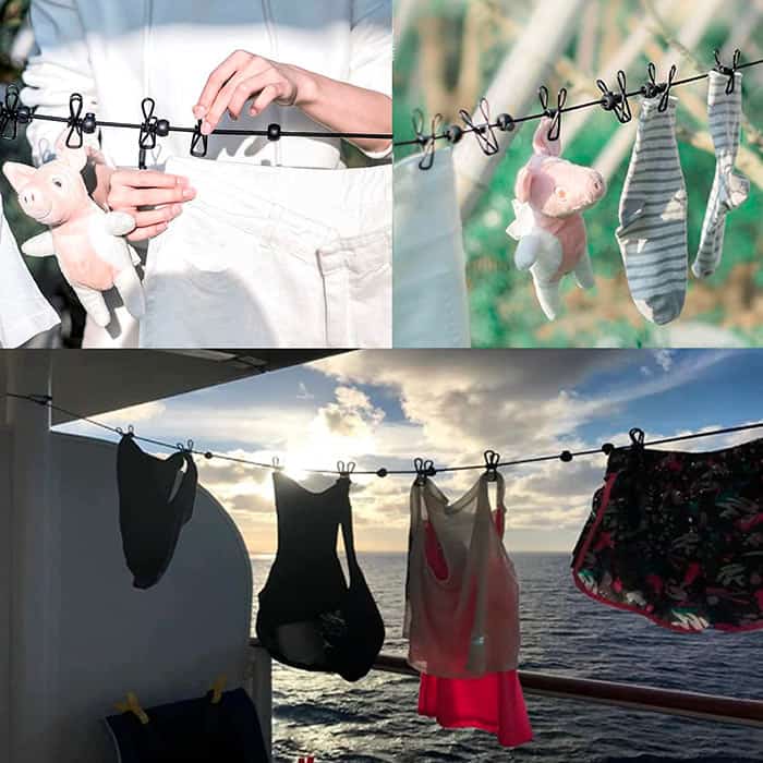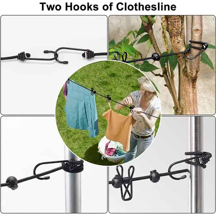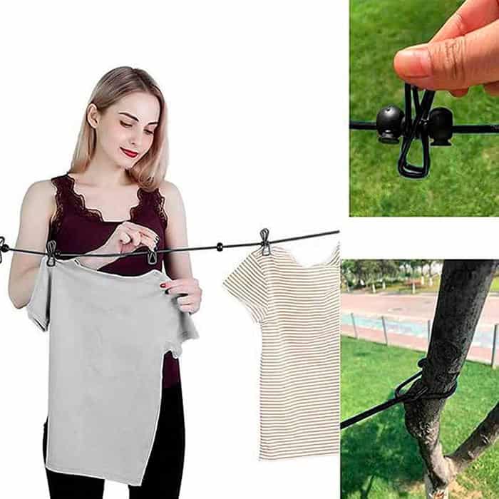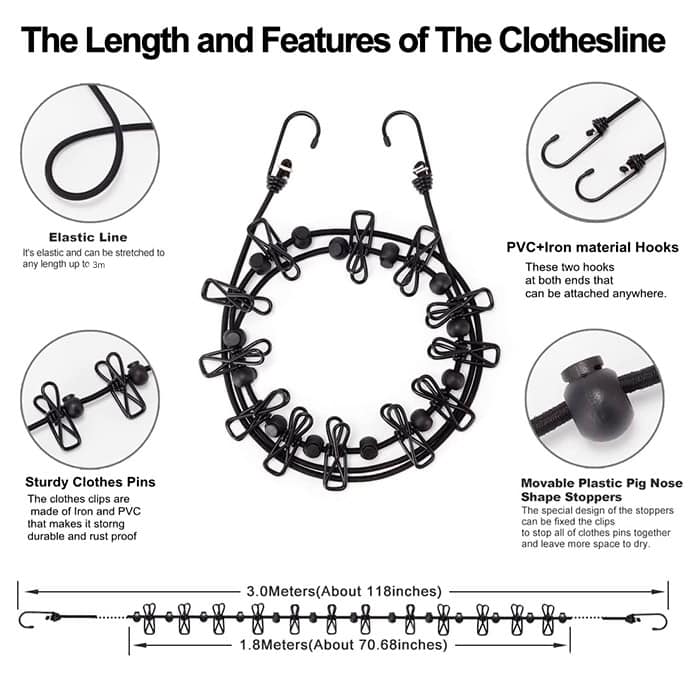 Sfoara pentru rufe este extrem de elastică, întinzându-se de la 175 la 300 cm! Funia este portabilă, iar cu ajutorul a 2 cârlige metalice o poți așeza oriunde vrei – în baie, între copaci, pe cârlige, între ferestre, în living sau pe balcon!
