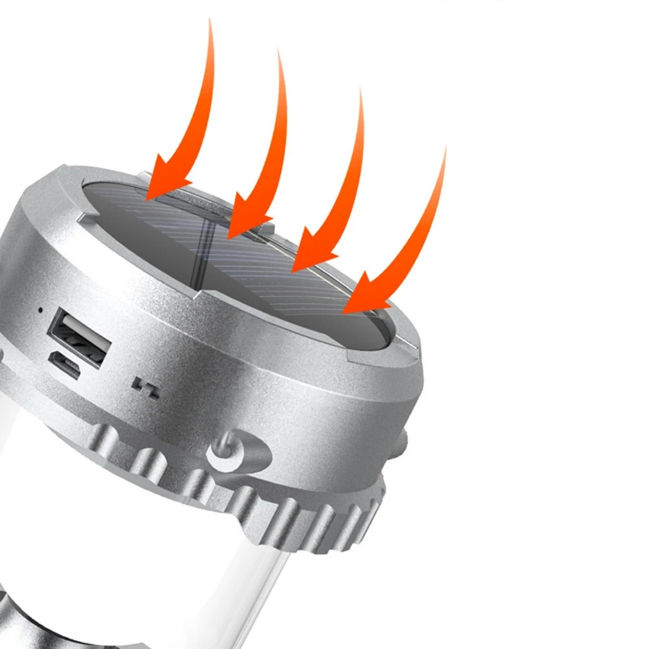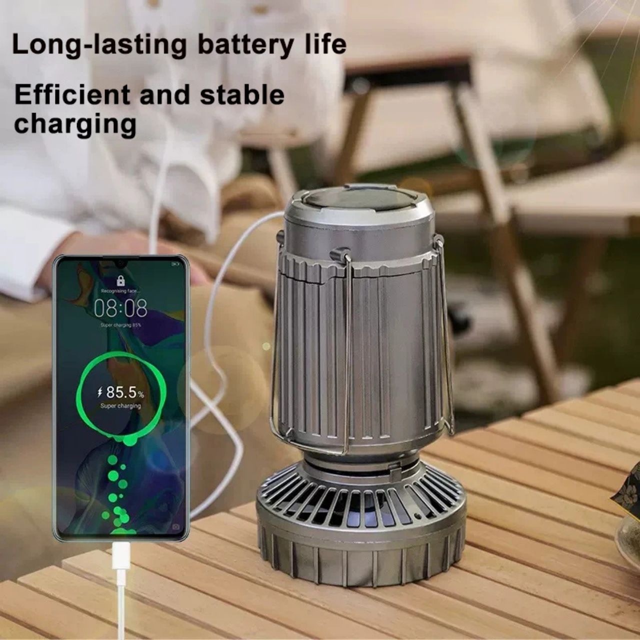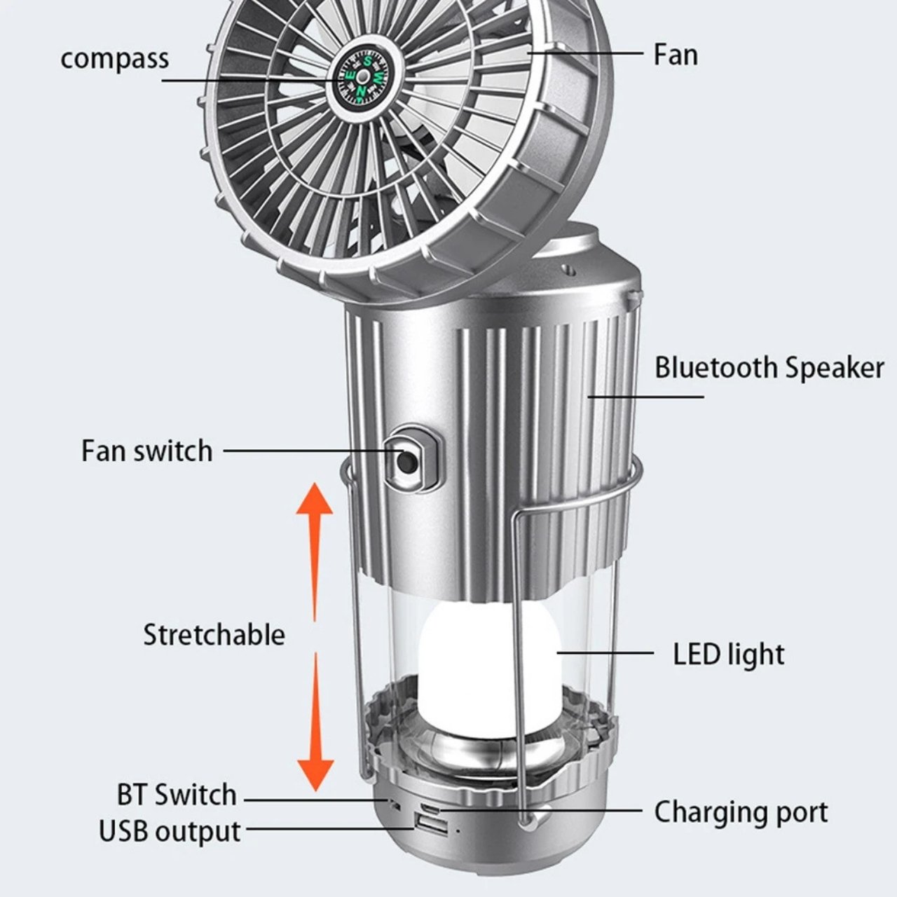 Soluția perfectă pentru camping, călătorii și situații de urgență – combinând 5 dispozitive într-unul! Acest dispozitiv versatil combină funcțiile unui ventilator, lanternă, difuzor, baterie powerbank și chiar un busolă. Cu opțiunea de a se încărca prin USB sau lumină solară, nu te va lăsa niciodată la greu. Este ideal pentru utilizare acasă, pe drum, în camping sau în timpul întreruperilor de curent.