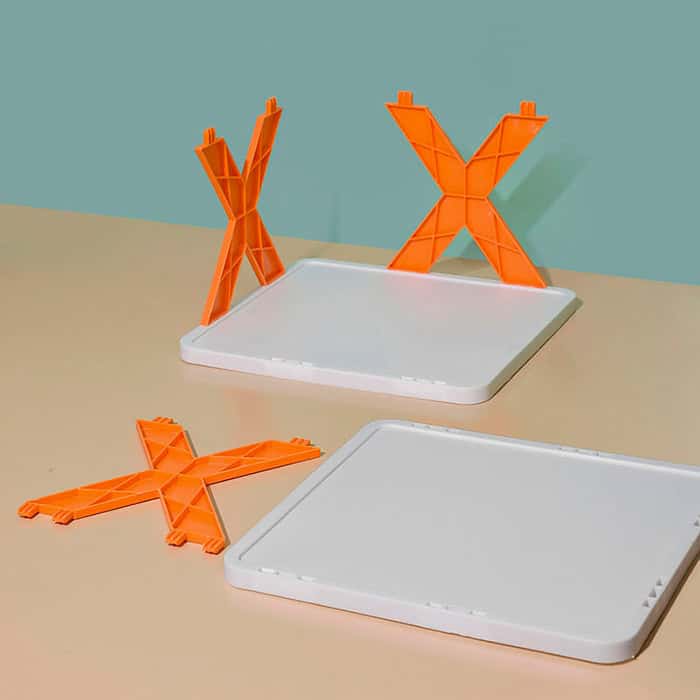 Îndoiți suportul pentru pantofi prin inserarea secțiunilor laterale portocalii în deschiderile din secțiunea albă. Continuați prin a le stivui și a le atașa unul deasupra celuilalt. Le puteți folosi pentru a depozita pantofi, chei, flori, etc.