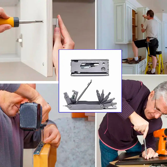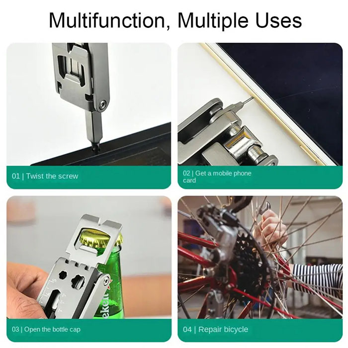 Unealtă de reparat lanțul, chei hexagonale de diverse dimensiuni, șurubelniță cruciformă, șurubelniță plată, șurubelniță de 25 mm, șurubelniță cu cui, deschizător de sticle, riglă, șurubelniță hexagonală, cheie hexagonală, cuțit zimțat și cuțit drept.
