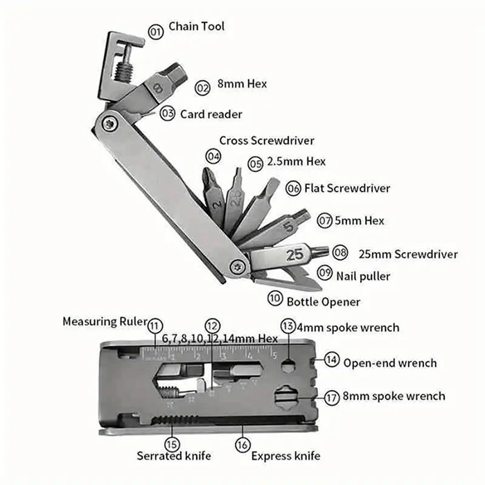 Unealta pliabilă de reparat biciclete pentru drum conține 17 accesorii într-un singur set!