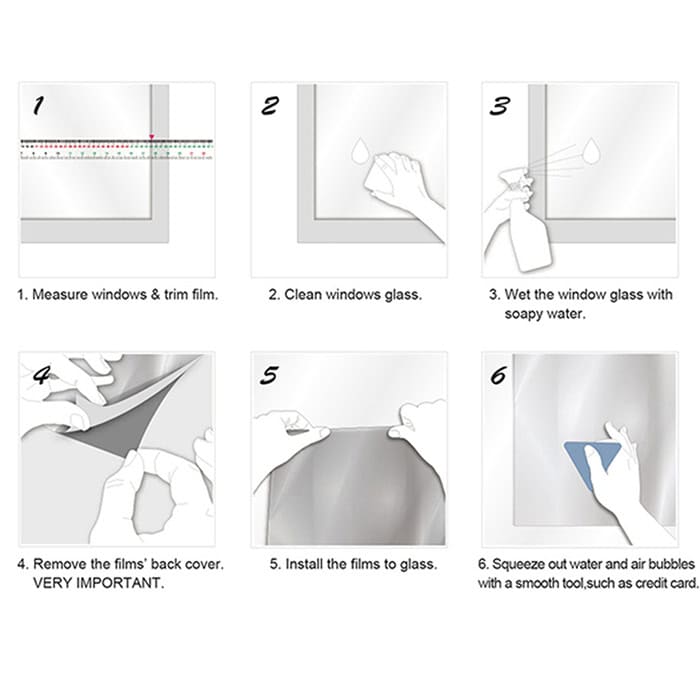 Măsurați suprafața și tăiați autocolantul. Curățați geamul. Udați geamul cu soluție de apă și săpun, iar apoi aplicați folia și neteziți-o cu o racletă pentru a îndepărta eventualele bule și excesul de apă.