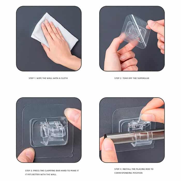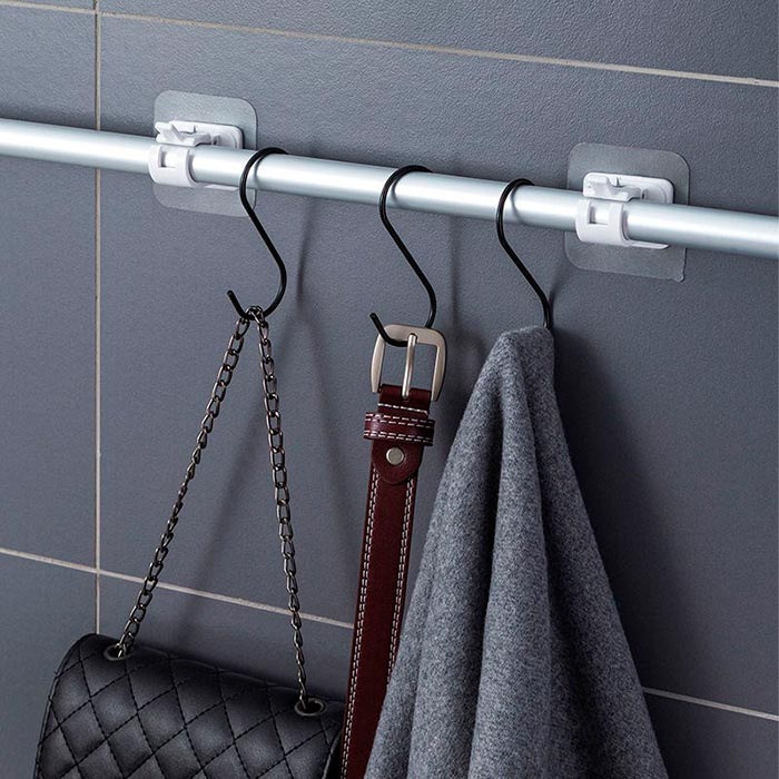 Pur și simplu așezați cârligele autoadezive pe o suprafață plană, introduceți tija între ele și agățați diverse accesorii, cum ar fi prosoape, ustensile de bucătărie, accesorii de modă etc.