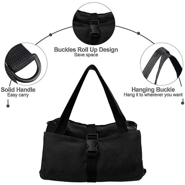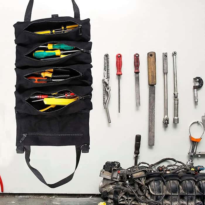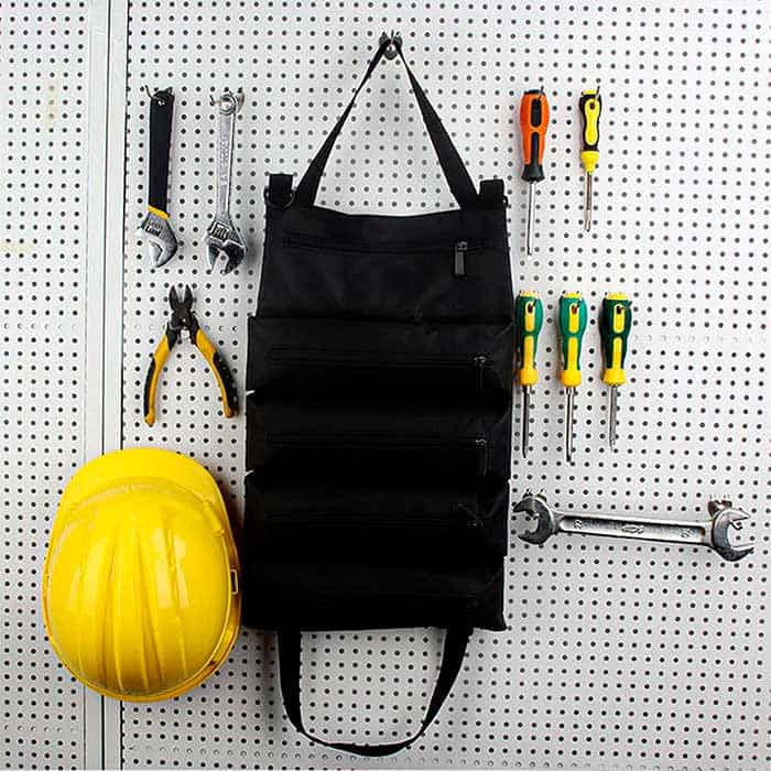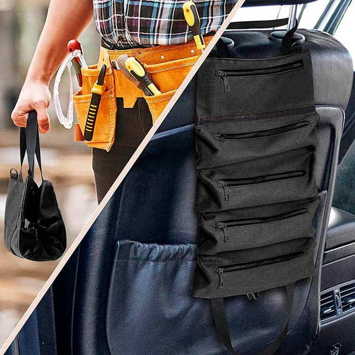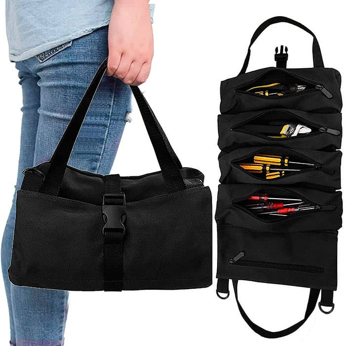 Geanta este potrivită pentru depozitarea diverselor unelte și alte accesorii. Poate fi agățată pe perete, în mașină, etc. De asemenea, are catarame pentru închidere.
